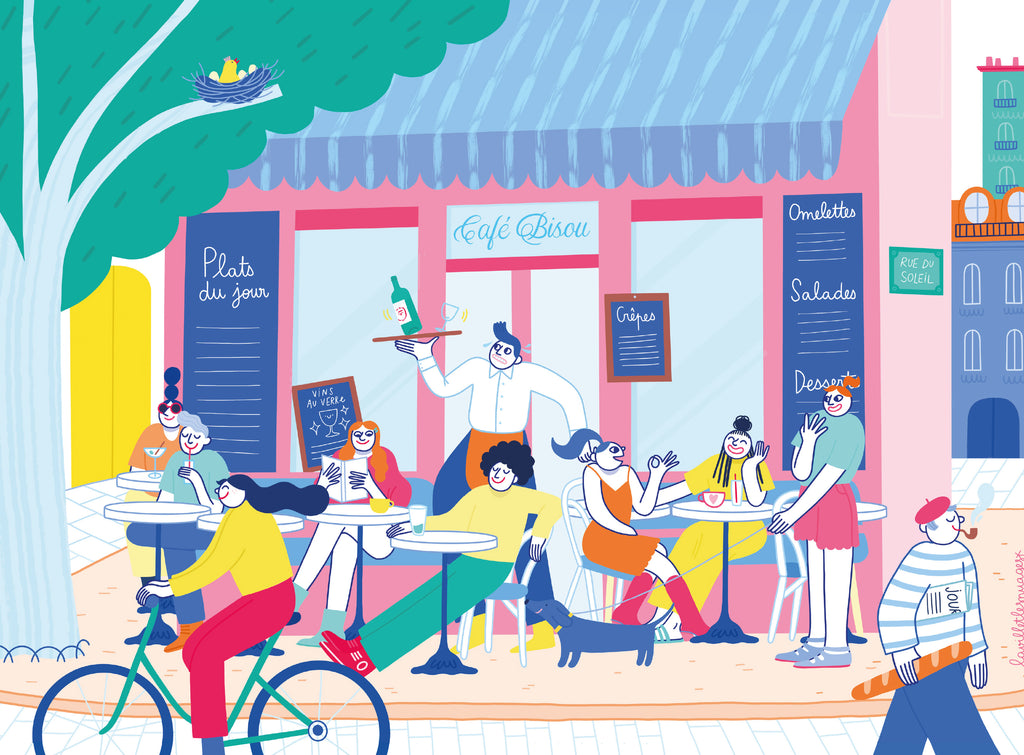 Découvrez l'atmosphère chaleureuse du Café bisou à travers ce puzzle de 1000 pièces célébrant la convivialité et les moments partagés. Reconstituez une terrasse accueillante où chacun trouve sa place, du client qui se prélasse au soleil aux amis qui papotent, en passant par les fidèles compagnons à quatre pattes. Un puzzle qui invite à ralentir et à savourer les petits bonheurs du quotidien.