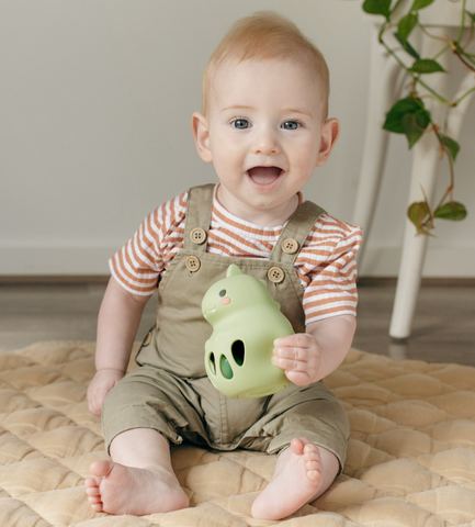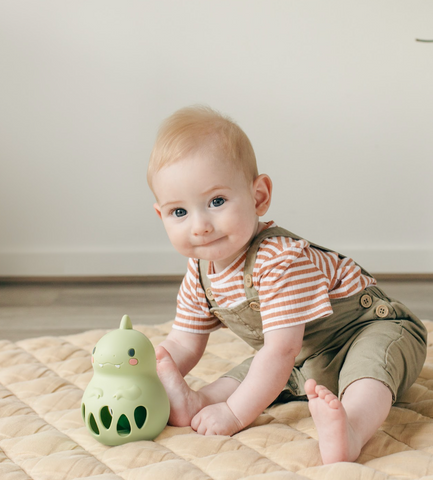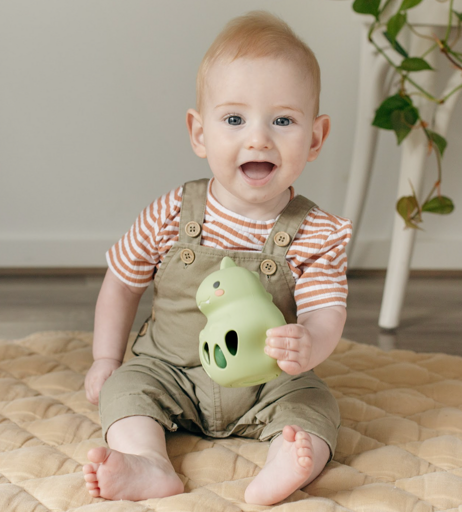 Le Hochet en silicone - Dino est l'accessoire indispensable pour votre bébé. Fabriqué en silicone de qualité alimentaire, ce hochet doux et moelleux est facile à saisir pour les petites mains. Lorsqu'on l'agite, il produit un doux son de hochet, stimulant ainsi la motricité fine de votre enfant. Un compagnon sûr et tendre qui apportera joie et confort à votre bébé.