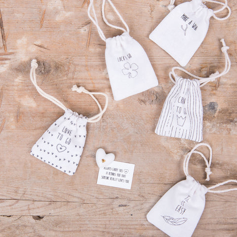 Un compagnon de poche pour vous accompagner partout ! Ce coeur en porcelaine servira de porte bonheur et de grigri pour vous aider à traverser les bons et les mauvais moments. Il sera rangé dans son petit sac en coton pour le protéger et lui offrir un nid douillet ! Prêt à vous accompagner partout où vous irez !