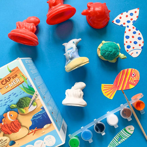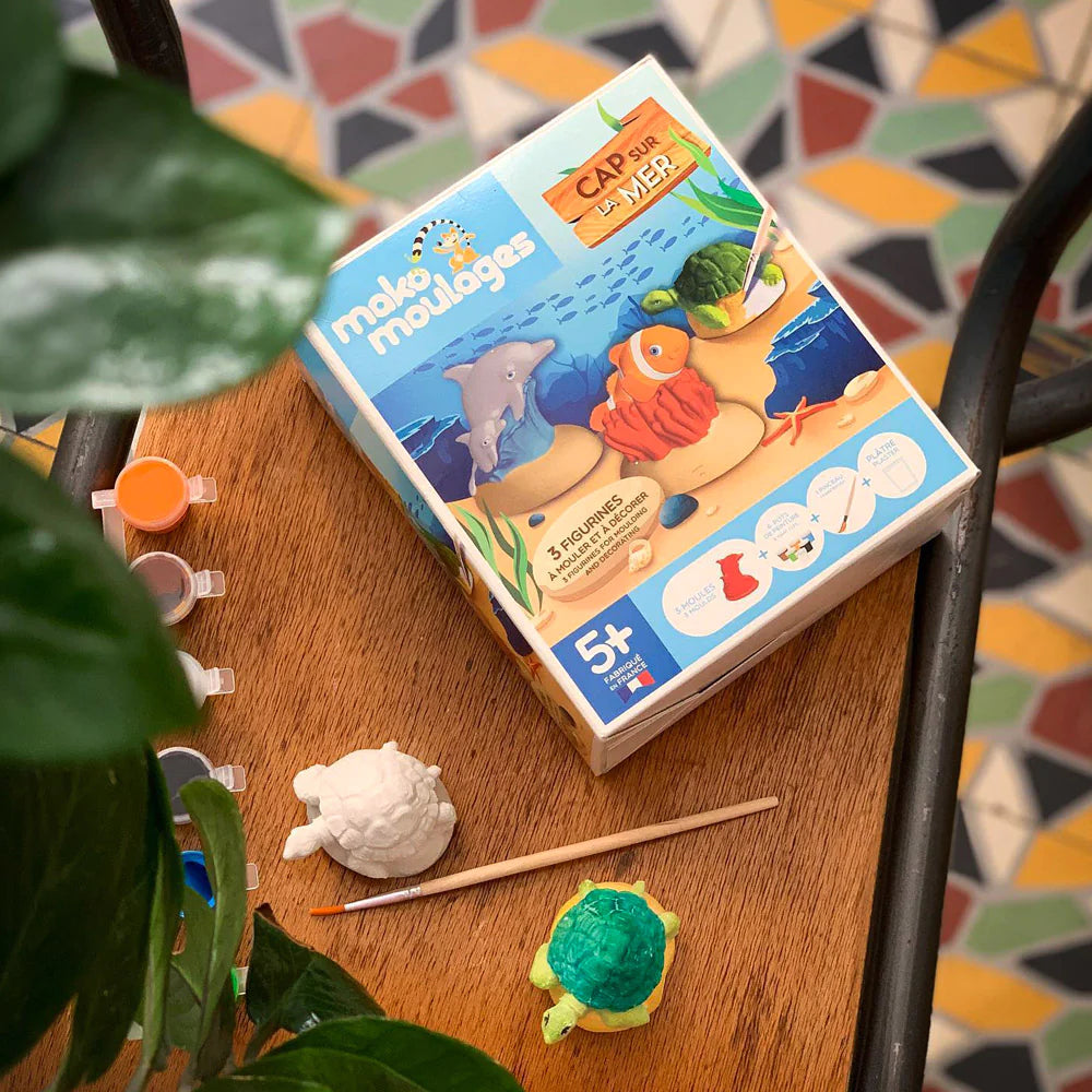 L’étui 3 moules cap sur la mer avec le dauphin et son petit, le poisson clown et la tortue. Un kit créatif complet pour mouler, démouler et personnaliser ses 3 animaux marins emblématiques ! Mako moulages, de la joie au bout des doigts ! Contenu : 3 moules en latex (poisson clown, dauphins et tortue), 3 sachets de 80g de plâtre, 6 pots de peinture 5 ml : marron, vert, blanc, orange, bleu, noir, 4 croisillons, 1 pinceau, 1 notice de jeu.