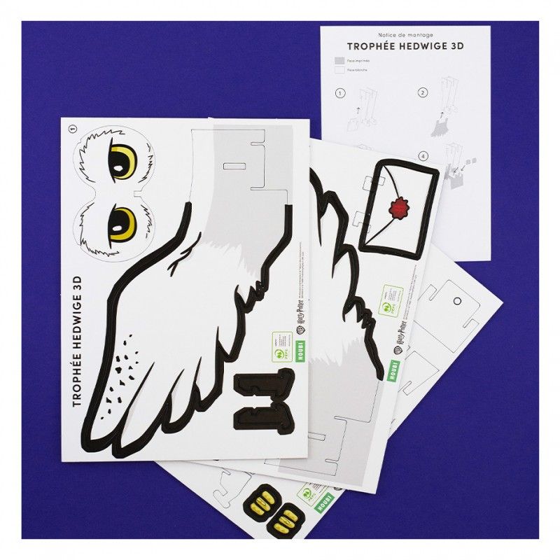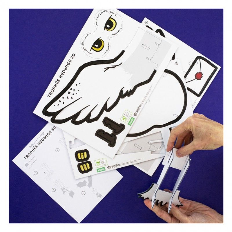 Chaque pièce s’emboîte facilement, sans colle ni ciseaux, pour révéler une majestueuse Hedwige à accrocher fièrement au mur de ta chambre.