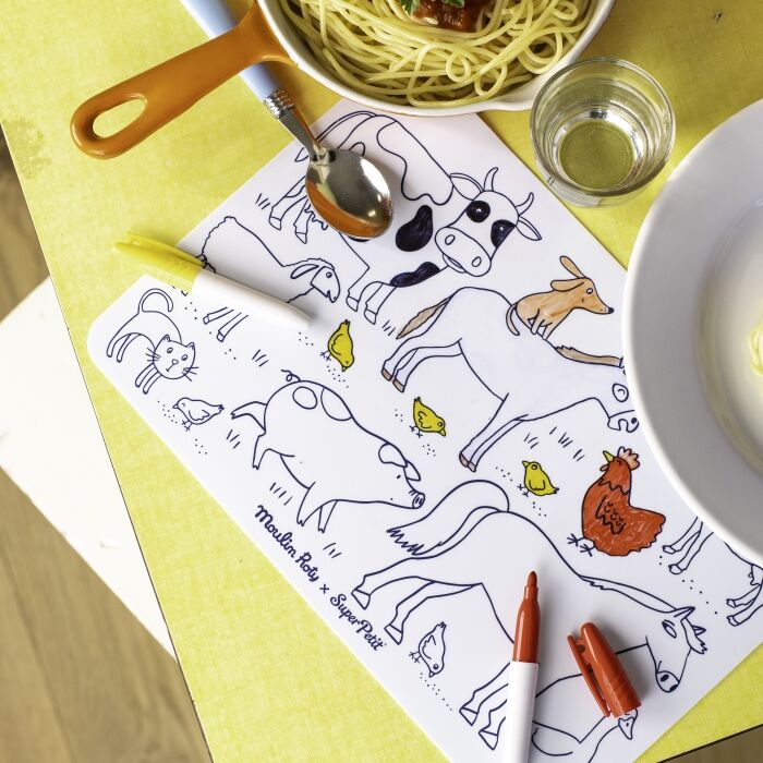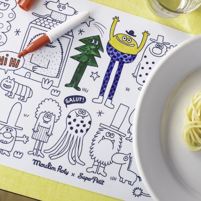 Colorie, efface et recommence à l'infini avec ce mini set Moulin Roty x SuperPetit en silicone et ses 4 feutres. Un côté coloriage et un côté dessin libre. Facile à transporter et à nettoyer !