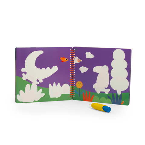 Avec un pinceau magique à réservoir d'eau, peignez les zones blanches des 10 décors illustrés des Toupitis pour en révéler les couleurs ! Réutilisable à l'infini, les dessins disparaissent une fois secs !