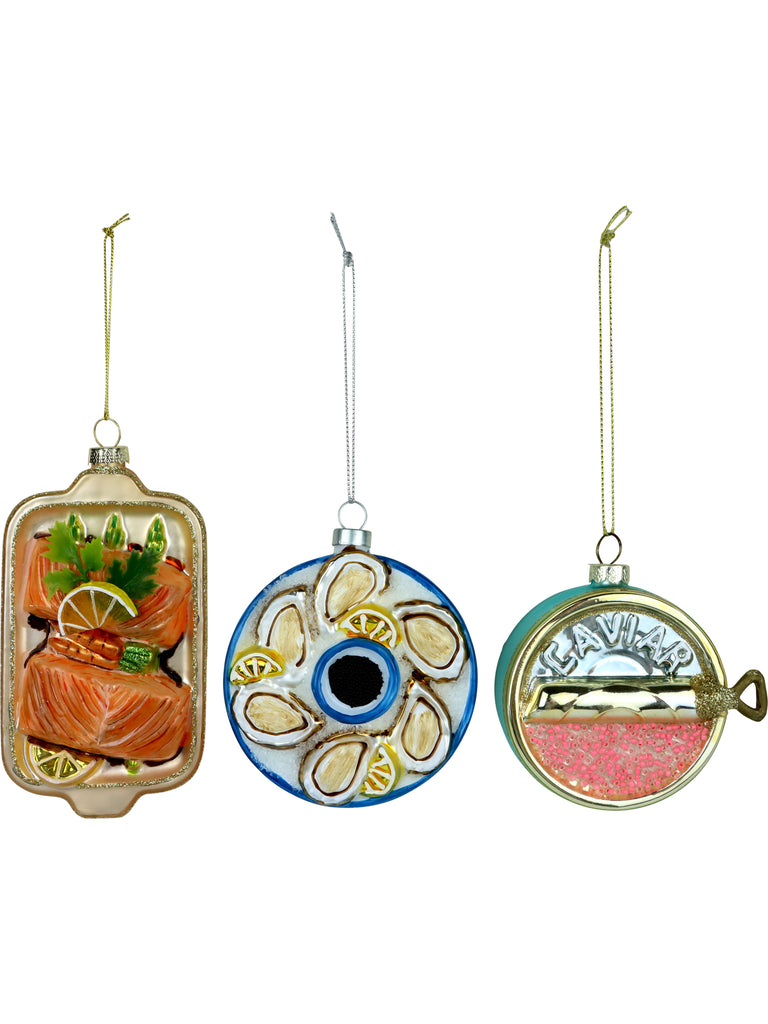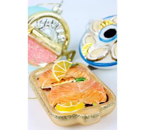 Découvrez notre Boule de Noël en verre Gourmet, l'ornement parfait pour les amateurs de saveurs raffinées. Choisissez votre préférence à l'unité : un plateau de saumon fumé délicat, une demi-douzaine d'huîtres fraîches et savoureuses, ou une boîte de caviar premium.