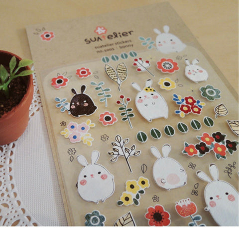 Une planche de stickers kawaii de la marque Suatelier. Décorez votre carnet, journal, téléphone... Avec ces petits lapins trop kiki !