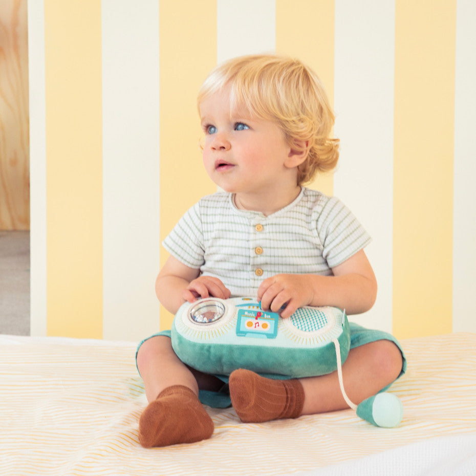 Vous êtes à l'écoute de Radio Joe, la musique sans interruption ! Cette adorable radio en tissu mettant en scène Joe le dragon offre 7 sons joyeux à découvrir. Équipée d'un boîtier sonore avec fonction ON/OFF, elle promet des heures de jeu et d'exploration musicale pour développer l'écoute. Le jouet d'éveil cache bien des surprises : une tête de lion transformée en hochet à billes colorées qui fascine bébé, et un bouton bleu coulissant au centre pour simuler le réglage du volume. En manipulant cette radio toute douce, votre enfant explore des textures variées et stimule sa motricité fine !
