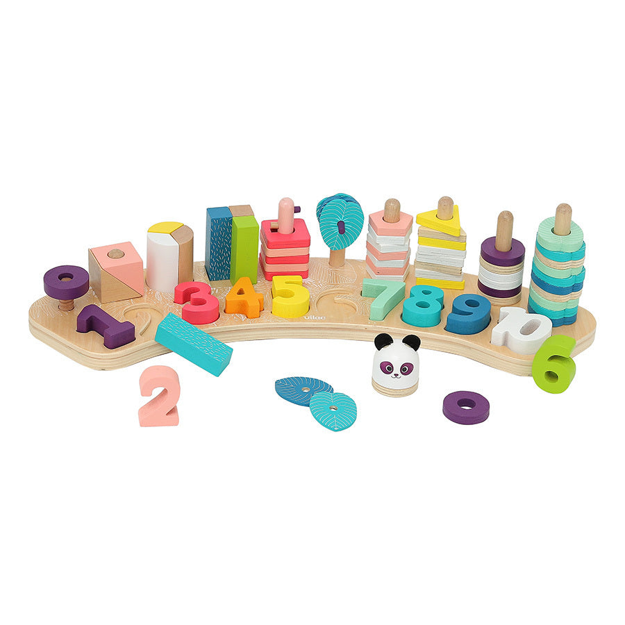 Ce jouet permet aux enfants de développer leur coordination manuelle et visuelle, d'observer, s'initier à la numération de 1 à 10, de trier par couleur et de classer, notions qu'ils acquerront naturellement. Accompagné par ses parents, l'enfant découvre toutes les richesses que propose ce jouet en bois. Etudié pour que l'enfant puisse également expérimenter seul, ce jouet d'éveil répond également à la pédagogie Montessori. • Un socle en bois. • 65 pièces en bois à encastrer, empiler, enfiler.