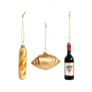 Une baguette, un croissant et du vin, rien de plus français que ces décorations pour orner votre sapin de Noel !