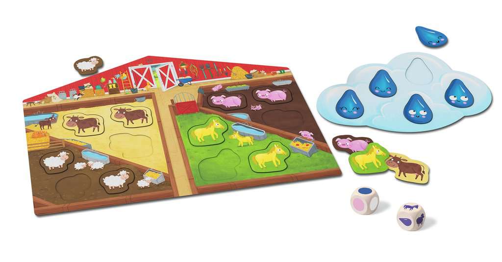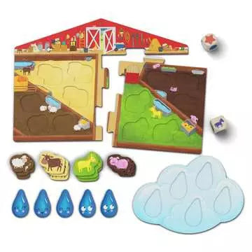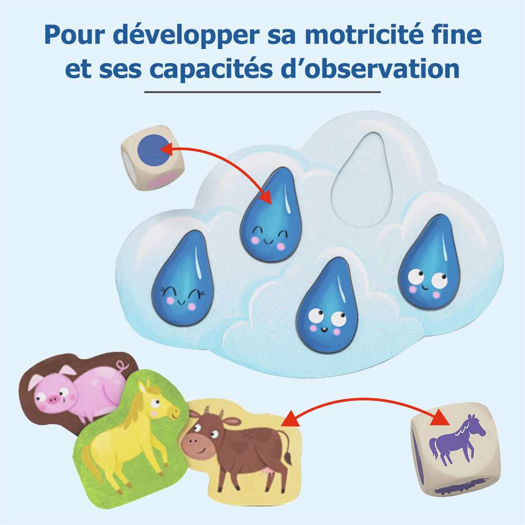 Il commence à pleuvoir... Vite ! Lance le dé et mets tous les animaux à l'abri ! À l'abri les Zanimos est un premier jeu coopératif pour les plus petits sur le thème de la ferme. Inclus 2 gros dés en bois, 12 jetons animaux et plusieurs modes de jeu. Initie les petits au jeu de société : reconnaître les couleurs, attendre son tour, faire ses premiers choix, etc. Dès 2 ans.