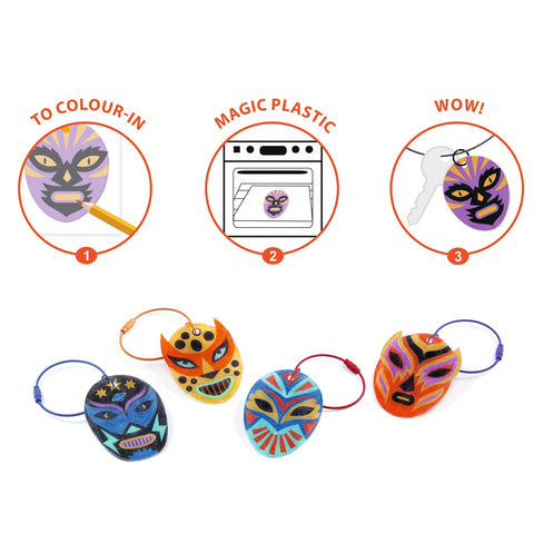 Ce kit propose à l’enfant de créer cinq porte-clefs hauts en couleurs représentant des masques de catcheurs mexicains à partir de plastique rétractable ! Pour cela, il place le modèle sous la silhouette en plastique transparente correspondante et reproduit le modèle avec les crayons de couleur. Une fois passées au four, la magie opère : les pièces rétrécissent en quelques secondes et le plastique devient rigide et épais. Il ne reste qu'à accrocher les réalisations masques aux anneaux colorés pour créer de beaux porte-clefs.