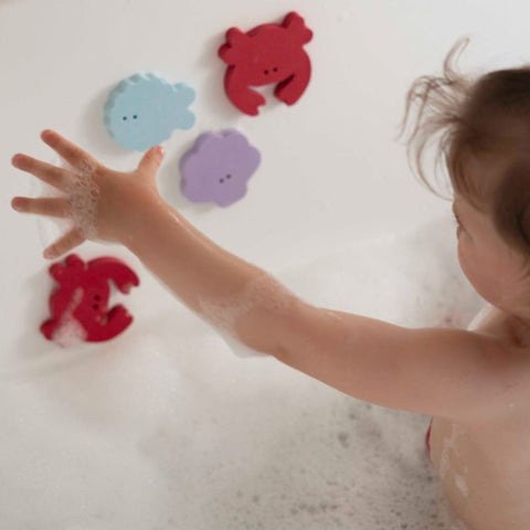 Dès 10 mois, bébé découvre les formes en mousse EVA douce qui flottent et adhèrent aux parois de la baignoire. Il s'amuse à les coller et décoller, développant sa motricité fine.