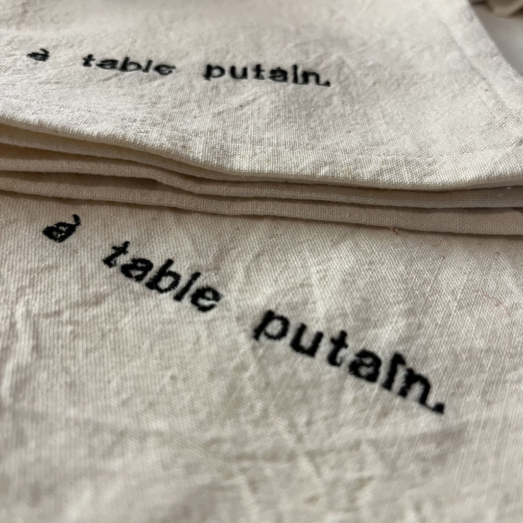 La serviette à table Putain, trône avec majesté et promet un confort et une utilité avec son tissu upcyclé. Sa broderie unique suscite la curiosité et attire tous les regards lors des festins partagés. Chaque serviette est unique grâce à sa couture, son tissu et sa broderie réalisée à l'atelier.