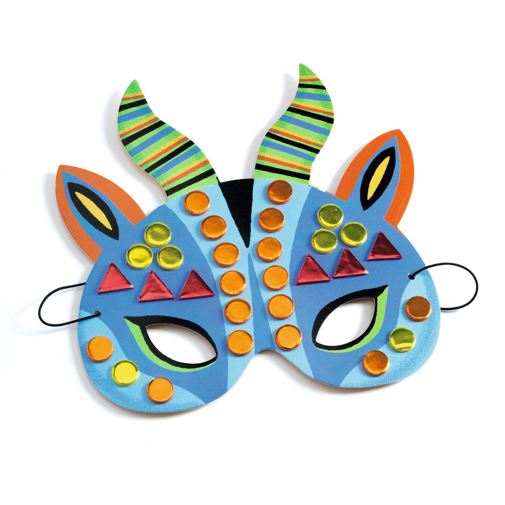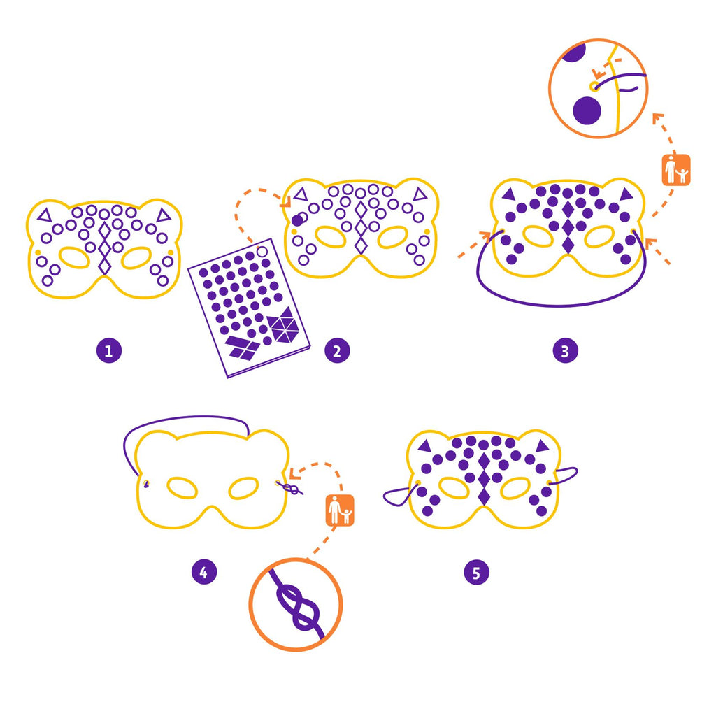 8 masques imprimés, 8 élastiques, 5 planches de stickers mosaïques métallisés en mousse, 1 notice explicative.