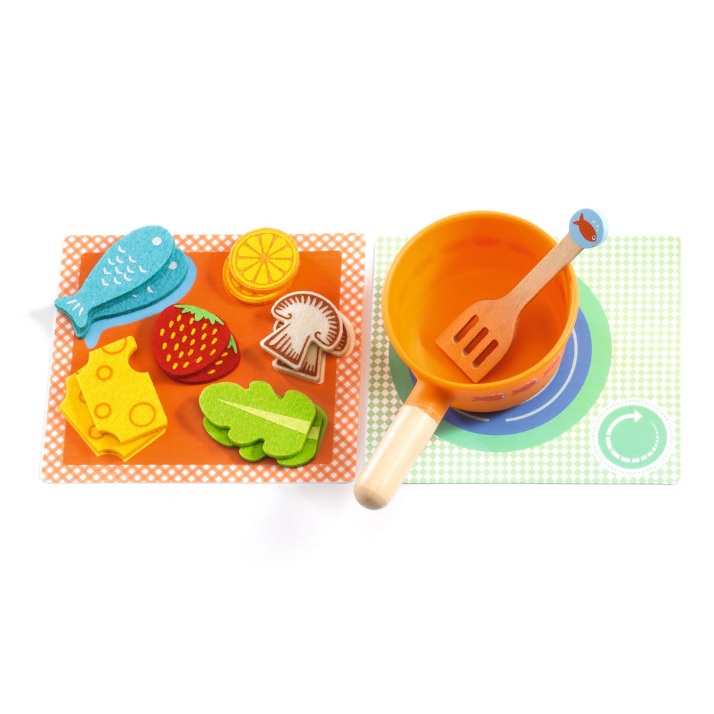 Il contient : 2 sets de table, 2 verres, 2 assiettes, 2 cuillères, 2 couteaux, 2 cuillères, un pichet, un set illustré avec une plaque de cuisson, une casserole et sa spatule, un set illustré avec des éléments en feutrine (2 feuilles de salade, 2 rondelles de champignons, 2 rondelles de citron, 2 tranches de fraises, 2 tranches de fromages et 2 poissons).