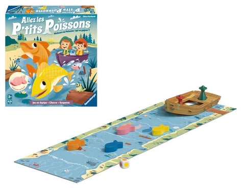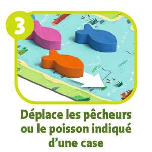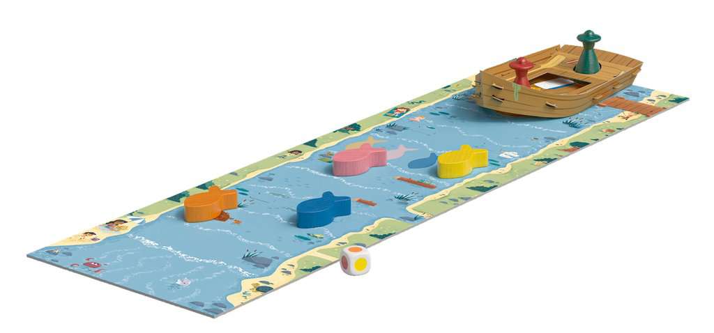 Il y a beaucoup d'agitation dans la rivière : les pêcheurs et les poissons font la course ! Lancez le dé et faites avancer d'une case soit le poisson de la couleur correspondante, soit le bateau avec les pêcheurs. Si les poissons atteignent la mer, ils sont sauvés ! Mais attention à ne pas se faire rattraper par les pêcheurs. En fin de partie, s'il y a plus de poissons sauvés que de poissons attrapés, l'équipe des poissons remporte la partie. Il faudra parfois faire un choix crucial !