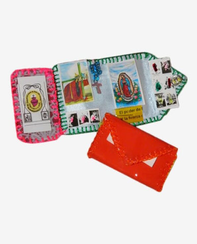 Petit autel de voyage portatif en plastique. Se présente en triptyque avec des images religieuses et une petite médaille de protection. Pratique, il se ferme et prend la forme d’une petite enveloppe. Ne prend pas de place, à mettre dans sa poche, son sac. Origine Mexique. Fait à la main.
