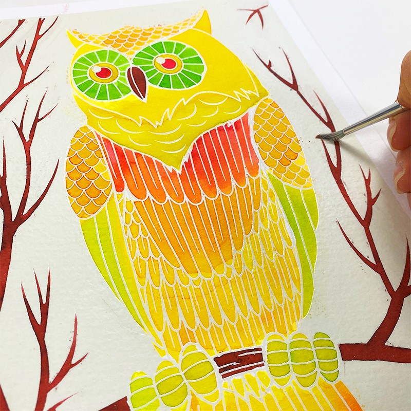 - Des illustrations serties qui apparaissent comme par enchantement à chaque coup de pinceau. En effet, elles ne laissent la peinture adhérer que sur des surfaces réservées.