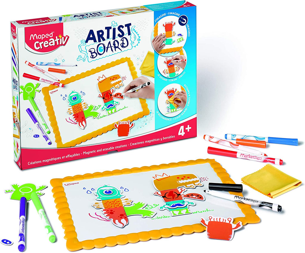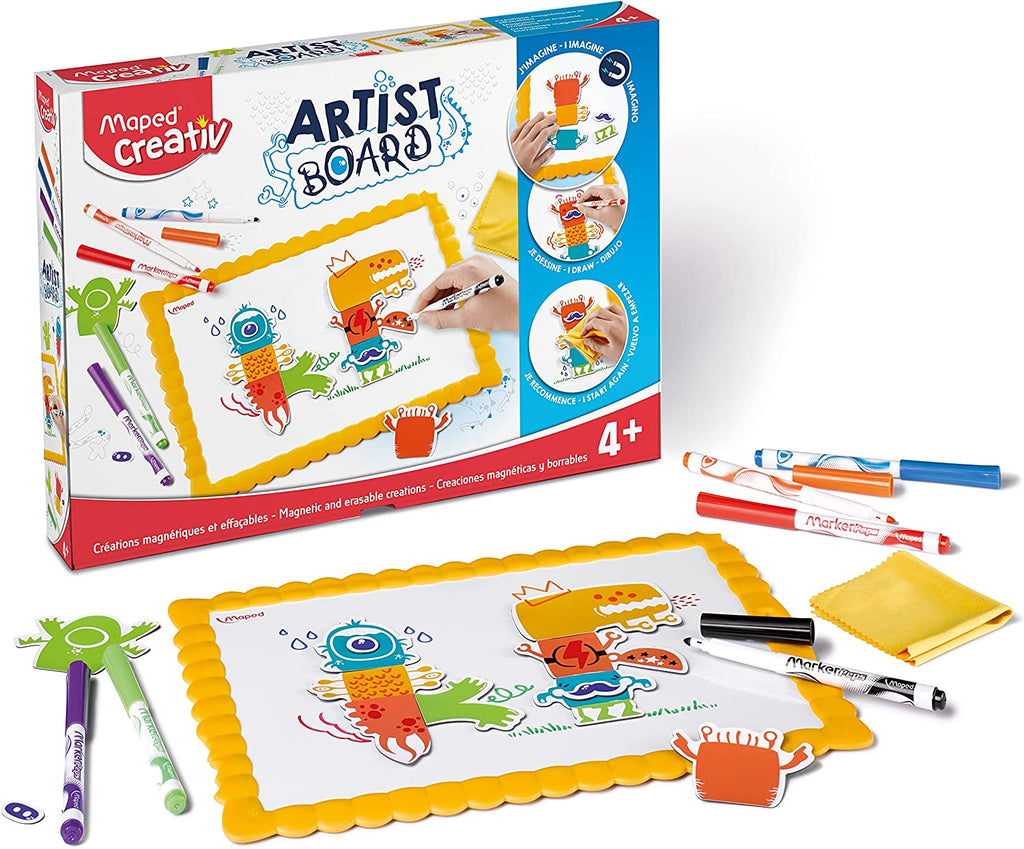 Une ardoise magnétiques, des aimants en forme de corps de petits montres et des 6 feutres effaçables pour recommencer à l'infini ! Donner vie à des créatures sorties de l'imaginaires des enfants et pousser sa créativité pour se surprendre à chaque dessin ! Dès 4 ans.