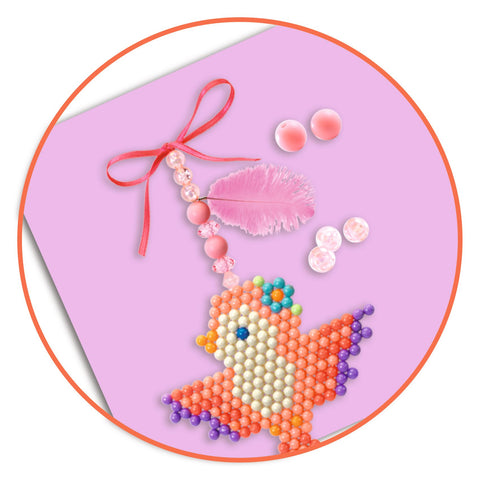 Un kit pour créer 3 suspensions en forme d’animaux avec des billes à eau. L’enfant place le modèle sous la plaque alvéolée transparente. Il positionne les billes colorées pour reproduire le modèle proposé, puis vaporise de l’eau sur sa réalisation. Une fois sèches, les billes restent collées les unes aux autres comme par magie ! Il assemble ensuite perles, ruban et breloques pour transformer ses créations en jolies suspensions.