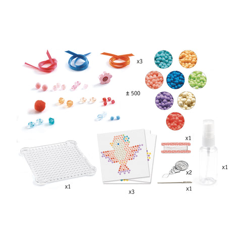Contenu : 1 plaque support de travail, 1 vaporisateur, 1 assortiment de billes plastique qui se collent à l'eau (8 couleurs), perles et breloques, fil élastique transparent, ruban de satin, 1 aiguille, 1 passe-fil, 1 livret d'explications pas à pas en couleurs.