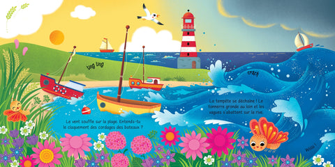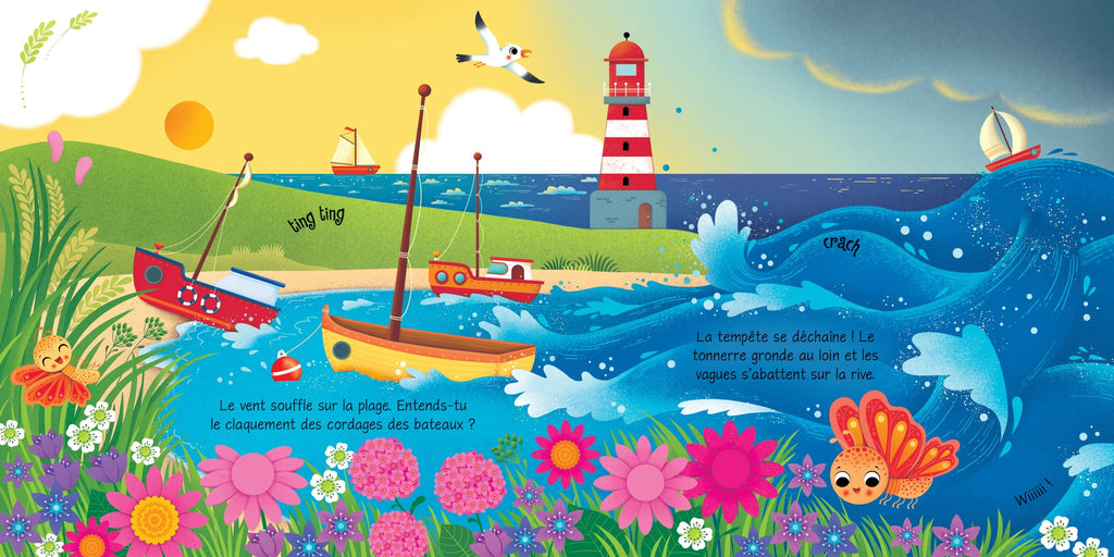 Le cri des mouettes, le bruit des vagues et le sifflement des dauphins font partie des dix enregistrements à écouter dans ce beau livre tactile qui évoque les vacances au bord de la mer. Les tout-petits prendront plaisir à regarder à travers les trous, à suivre du doigt les chemins en creux, à observer et à commenter de nombreux détails au fil des illustrations pleines de charme.
