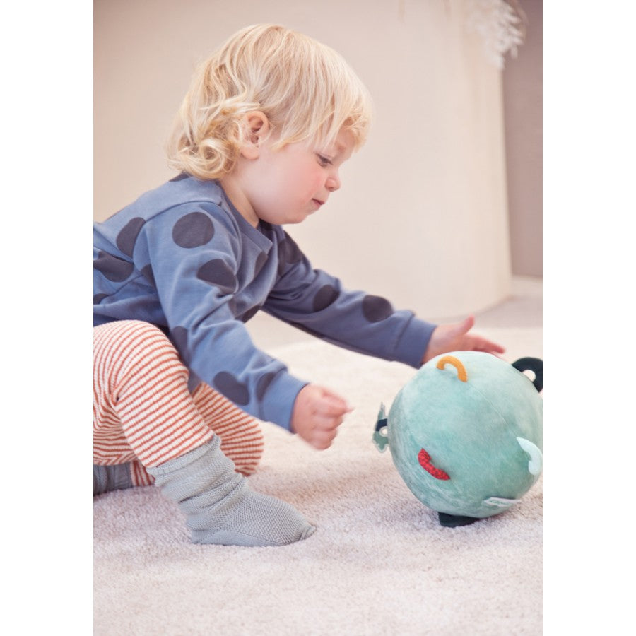 Cette balle sensorielle en tissu de couleur verte, sur laquelle trône Joe le Dragon, dispose de poignées aux diverses matières afin de stimuler la motricité fine. A l’intérieur se trouve un boitier musical retirable qui émet 7 sonorités musicales pour stimuler l'ouïe. A l’aide d’un bouton sur celui-ci, vous pouvez à tout moment décider d’activer ou non les sonorités. Elle est facile à manipuler par les petites mains et stimulera les sens des plus petits grâce aux diverses matières et sons. Les bambins peuvent en outre déployer leurs talents de lanceur ou de footballeur en toute sécurité.