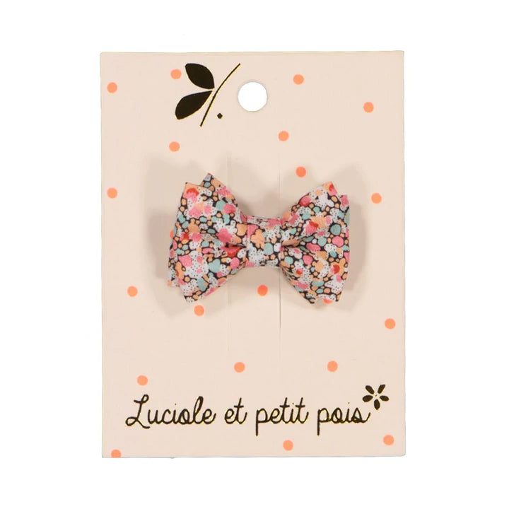 La barrette mini nœud double en Liberty Pepper Corail est parfaite pour une première coiffure à croquer !