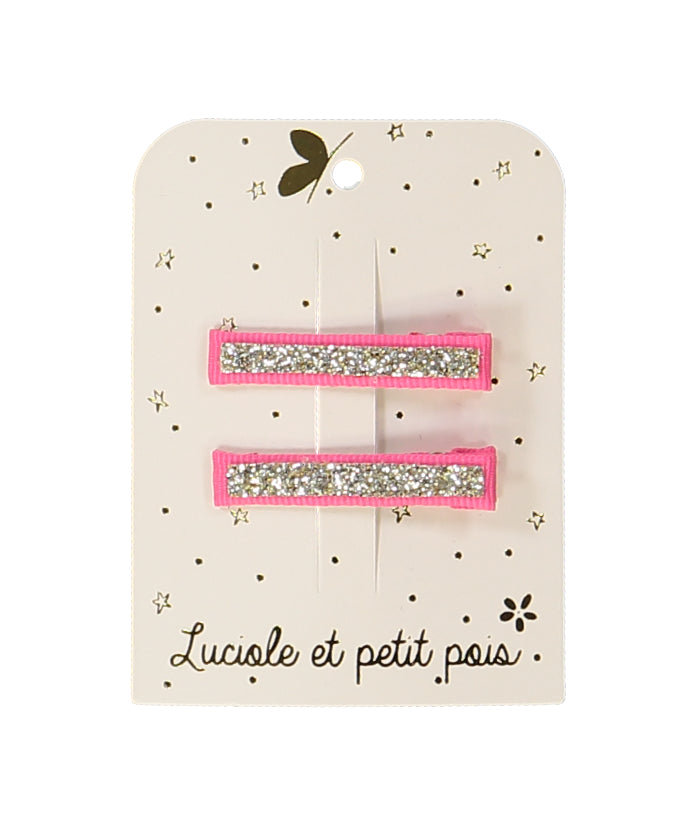 Paires de pinces crocodile 5 cm pour tenir tout type de cheveux. Les pinces sont recouvertes d’une bande colorée et accompagnées d’une fine bande de tissu glitter.