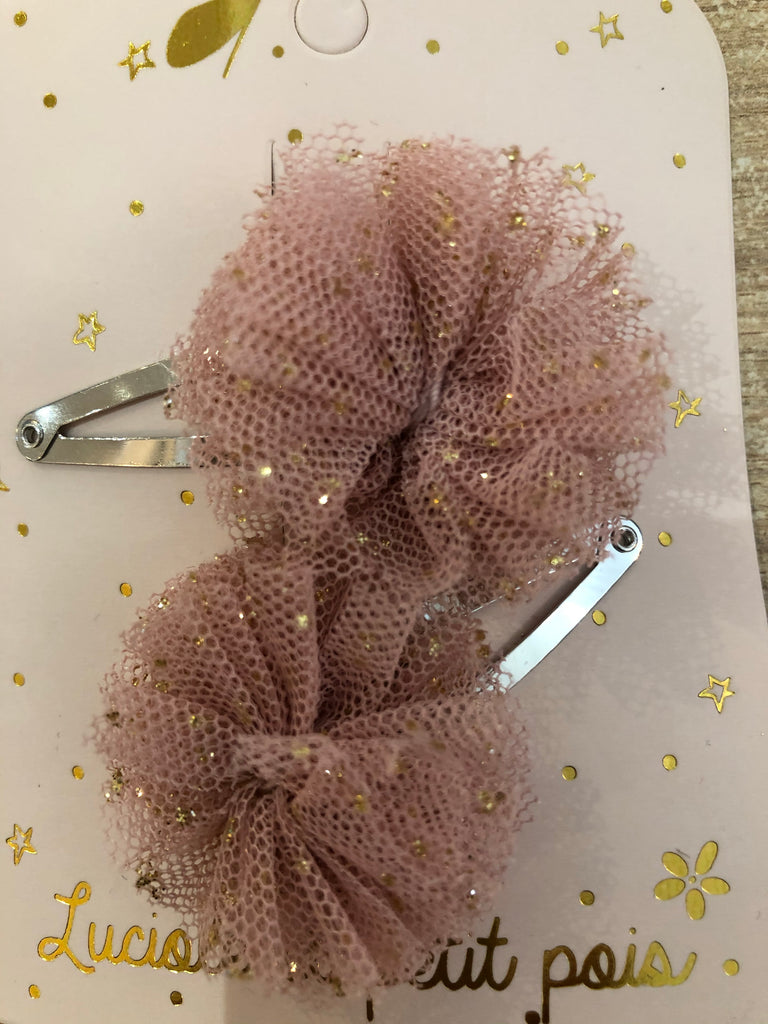 Barrettes en tulle cousues sur des pinces clic clac de 4 cm.