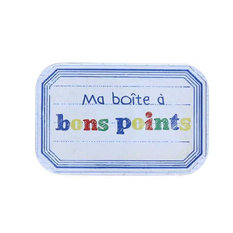 En métal, cette petite boîte va faire le bonheur de votre enfant. Dessus on peut y lire "Ma Boîte à bons points" sur un dessin d'une étiquette d'école. Profitez donc de la rentrée scolaire pour vous munir de cette boîte à bon points qui va ravir votre enfant. A glisser dans son cartable ou son sac à dos pour qu'il y mette ses récompenses et images.