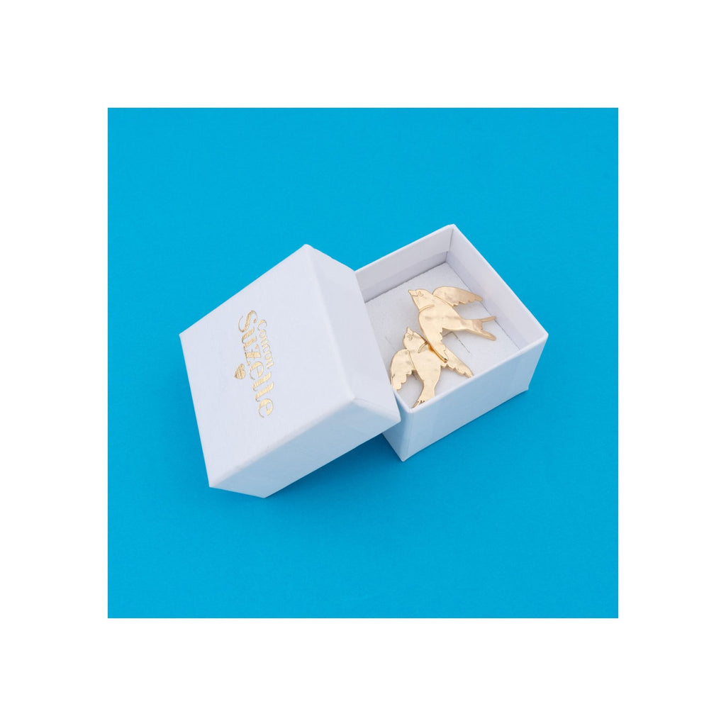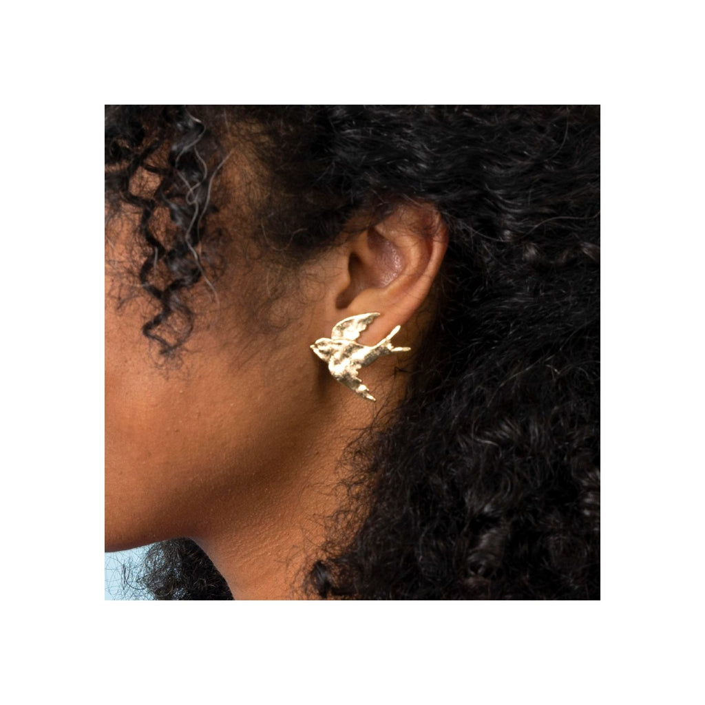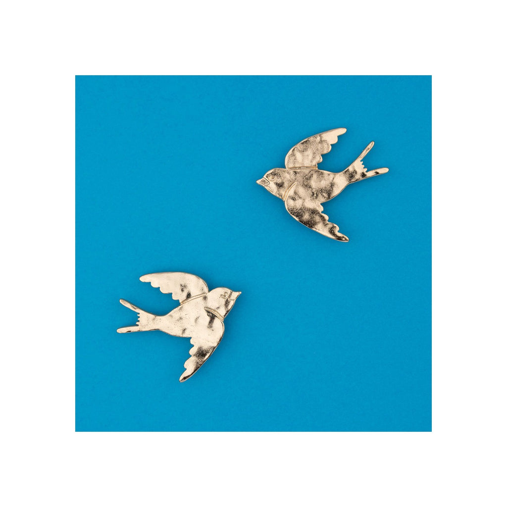 Découvrez les boucles d'oreilles Hirondelle de Coucou Suzette, un bijou original plaqué or avec un effet martelé. Laissez de côté les anneaux classiques et optez pour ces petits oiseaux dorés qui ajouteront une touche de fantaisie à votre tenue. Associez-les à une coiffure haute et profitez des compliments !