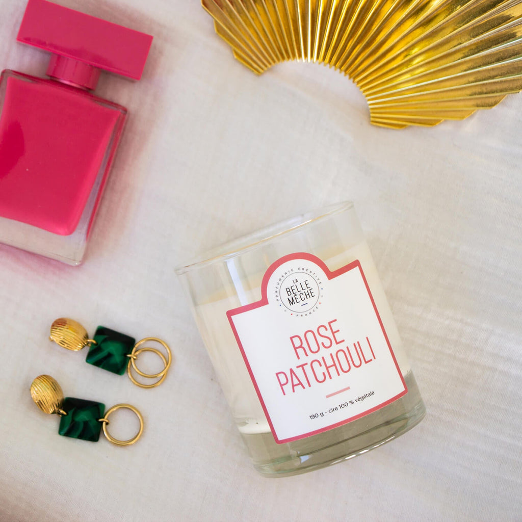 Une senteur capiteuse et orientale pour un parfum très féminin. La bougie parfumée Rose Patchouli c'est un cœur floral aux notes de rose, jasmin et muguet, équilibré par des notes orientales de patchouli et de santal. Sensuelle, cette bougie parfumée à la cire naturelle sera utilisée pour une soirée intime ou pour parfumer une chambre. Une bougie naturelle pour une idée cadeau idéale.