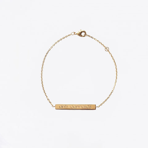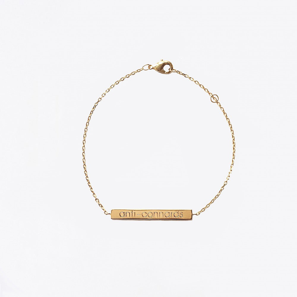 Bracelet ANTI-CONNARDS en plaqué or 24 carats. Longueur : 18cm avec anneau supplémentaire à 16cm. A garder jour et nuit pour être bine protégé ! Fabriqué avec humour à Paris. GARANTI 1 AN par Félicie Aussi !