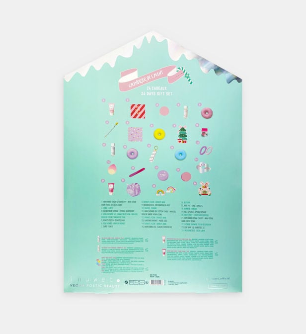 Les surprises à l'intérieur : 1. Mini crème mains parfum fraise des bois 20ml - 2. Carte à message - 3. Eponge visage microfibre - 4. Mini gel douche fleur d'oranger 20ml - 5. Donut bain rose - 6. Crayon à papier - 7. Carte à message - 8. Donut bain jaune - 9. Décoration en bois pour sapin - 10. Gomme - 11. Mini gel douche barbe à papa 20ml - 12. Donut bain mauve - 13. Porte clés - 14. Donut bain bleu - 15. Élastiques pour cheveux x2 - 16. Blender - 17. Lime à ongles - 18. Miroir - 19. Eponge visage - 20. Chouchou cheveux irisé - 21. Mini crème mains parfum cerise 20ml - 22. Fleur de douche - 23. Lot de 2 barrettes arc en ciel cheveux - 24. Décoration en bois pour sapin
