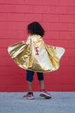 Cette cape super-héros est réversible : or métallisé avec un éclair rouge d'un côté et rouge métallisé avec un cercle bleu foncé et une étoile à paillettes dorées de l'autre. Elle est bordé d'or et doté d'une fermeture velcro. Facile à enfiler et à retirer !