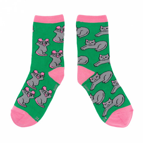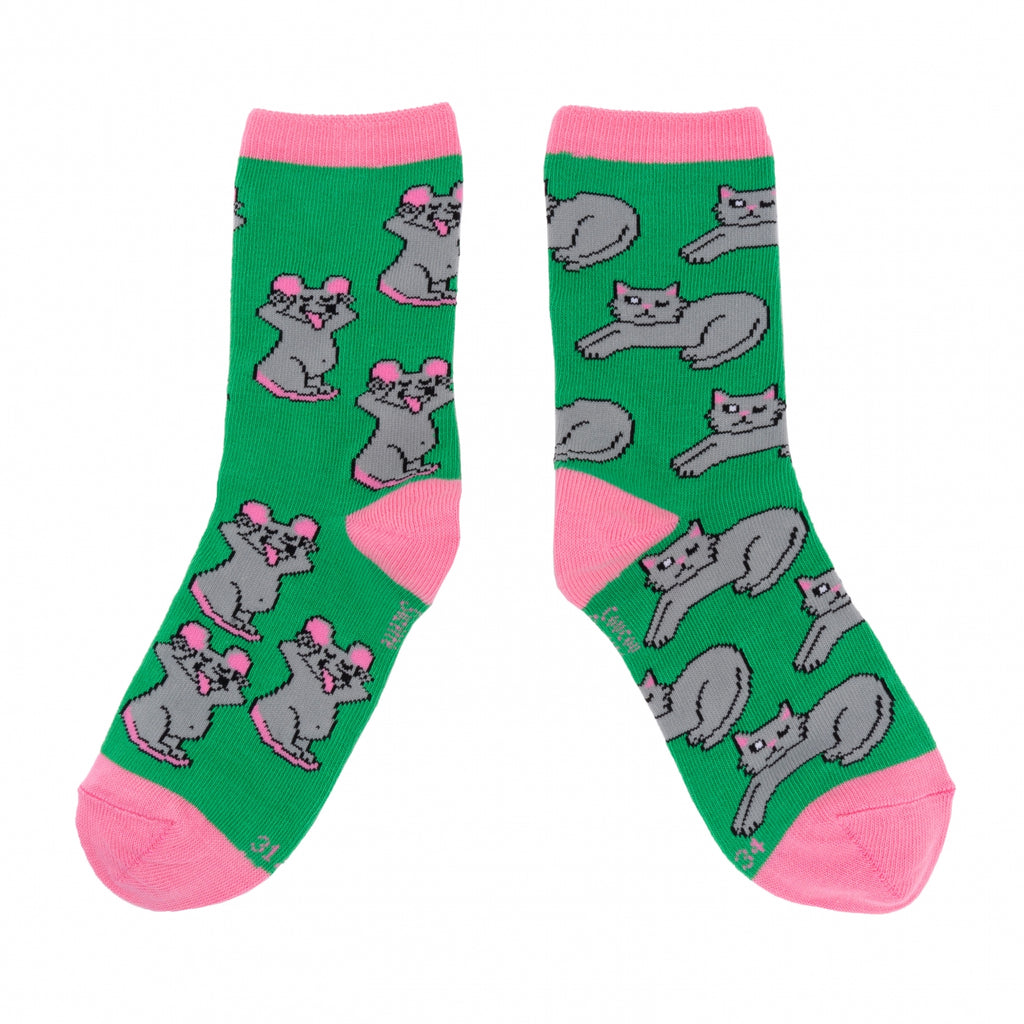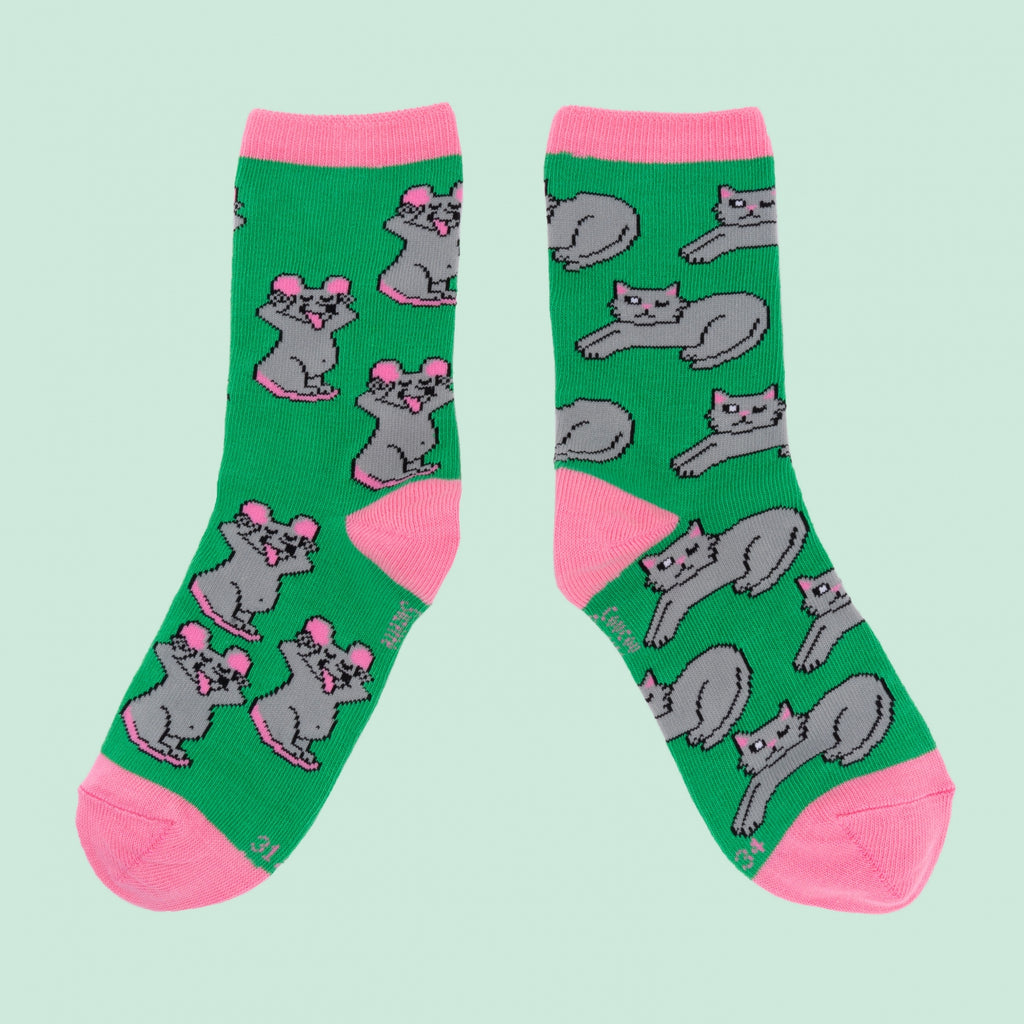 Des chaussettes rigolotes vertes, roses et grises, fabriquées en France en coton certifié Oeko-Tex, qui vont aussi bien aux filles qu’aux garçons !