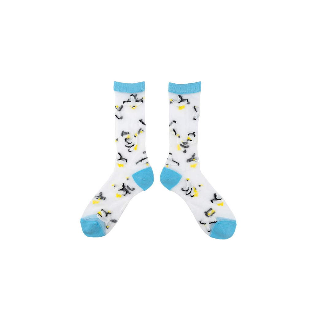 Une bande de joyeuses mouettes pour décorer cette paire de chaussettes transparentes. Même si ce bestiau nous pique nos frites en été, on l’adore pour son chant qui nous donne instantanément l’impression d’entendre la mer et d’être en vacances.