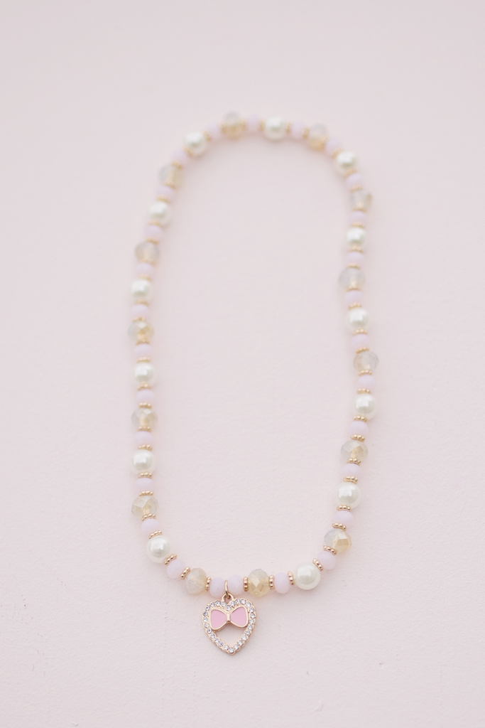Le collier Boutique Love est l'un de nos colliers les plus élégants à ce jour ! Il est composé de perles roses, blanches et dorées et se termine par une breloque en forme de cœur et de nœud incrustée de strass. Ce collier est aussi doux que possible !