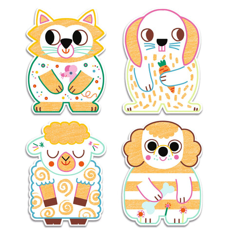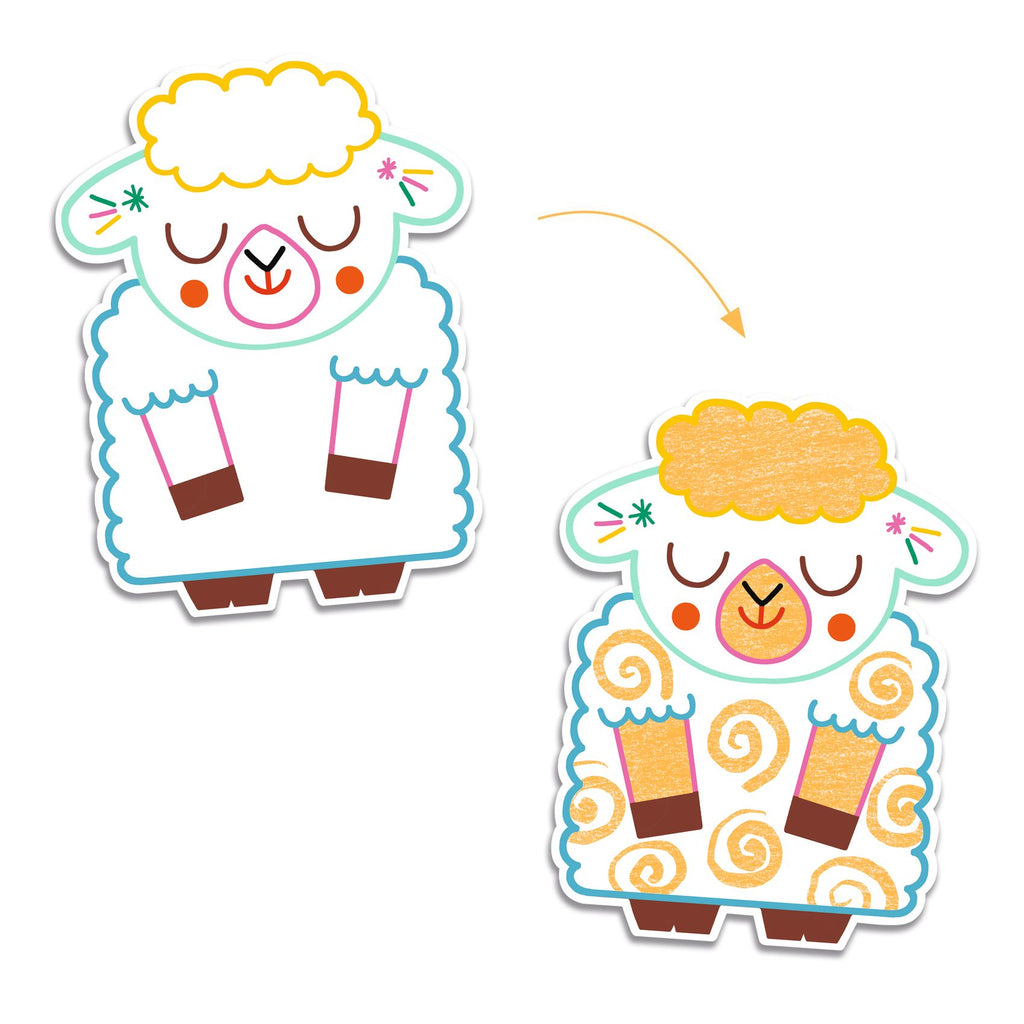 Une pochette de 12 images à colorier avec un gros crayon de couleur, adapté pour les petits enfants. L'enfant colorie les animaux familiers à l'aide du crayon pour découvrir ce qui se cache. C'est magique : le crayon ne marque que sur certaines zones, des motifs apparaissent et révèlent des surprises !