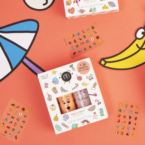 CRAC ! En route pour un programme 100% fun avec ce chouette duo de vernis kids corail et paillettes. Cerise sur ce gateau coloré : une planche de stickers pour les ongles. Objectif douceur et bonne humeur !