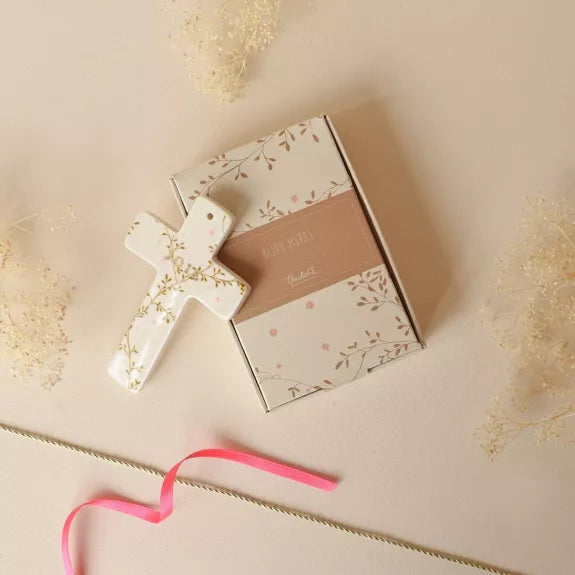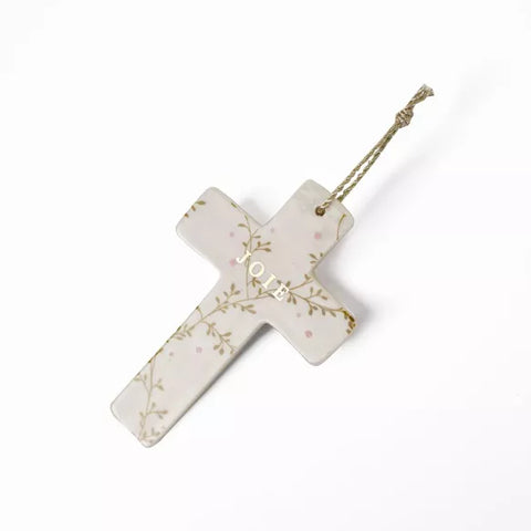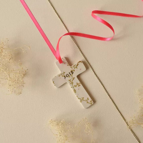 Ajoutez une touche de joie et de poésie à votre décoration avec la croix murale Hortense. Ce bijou délicat peut être accroché ou posé et est idéal pour célébrer un baptême ou une communion avec son message doré "joie". Deux cordons sont inclus pour une personnalisation flashy ou classique.