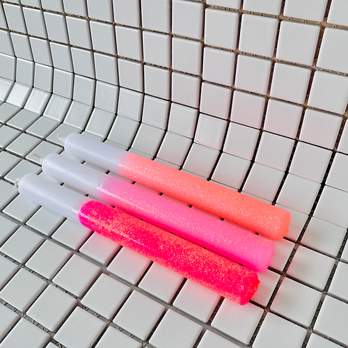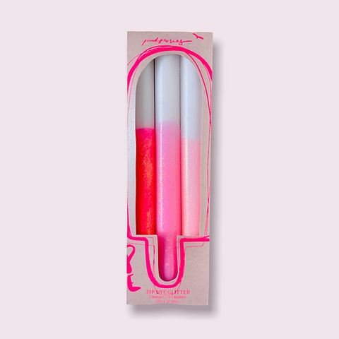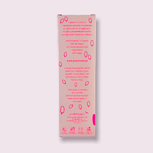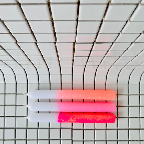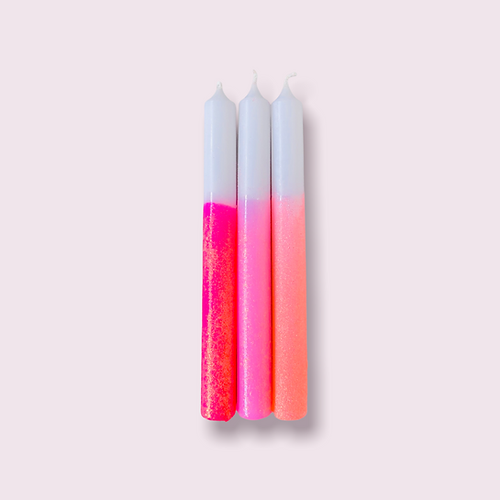 Ensemble de trois bougies au look néon joliment colorées à la main. Les couleurs restent les mêmes, les motifs varient avec chaque bougie et les rendent uniques. Coloré dans une institution sociale dans les magnifiques contreforts des Alpes.