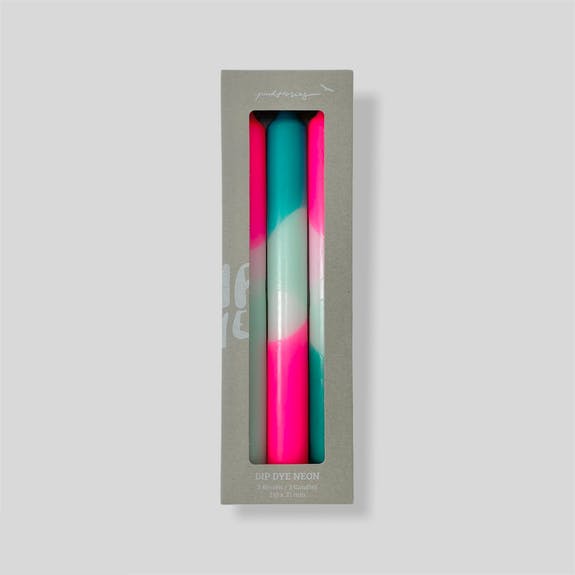Ensemble de trois bougies au look néon joliment colorées à la main. Les couleurs restent les mêmes, les motifs varient avec chaque bougie et les rendent uniques. Coloré dans une institution sociale dans les magnifiques contreforts des Alpes.
