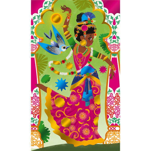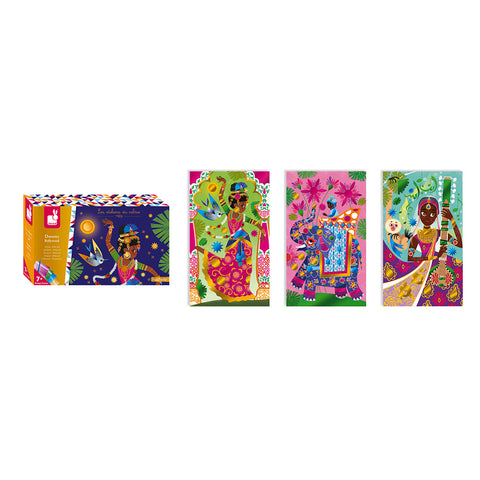 Réalise de jolis tableaux brillants sur le thème Bollywood pour décorer ta chambre. Pour cela, c’est facile, il suffit de soulever la partie prédécoupée avec l'outil prévu à cet effet et de décorer avec les feuilles métallisées. Ce kit contient 3 tableaux autocollants à décorer avec 8 feuilles métallisées (4 couleurs) et 1 spatule.