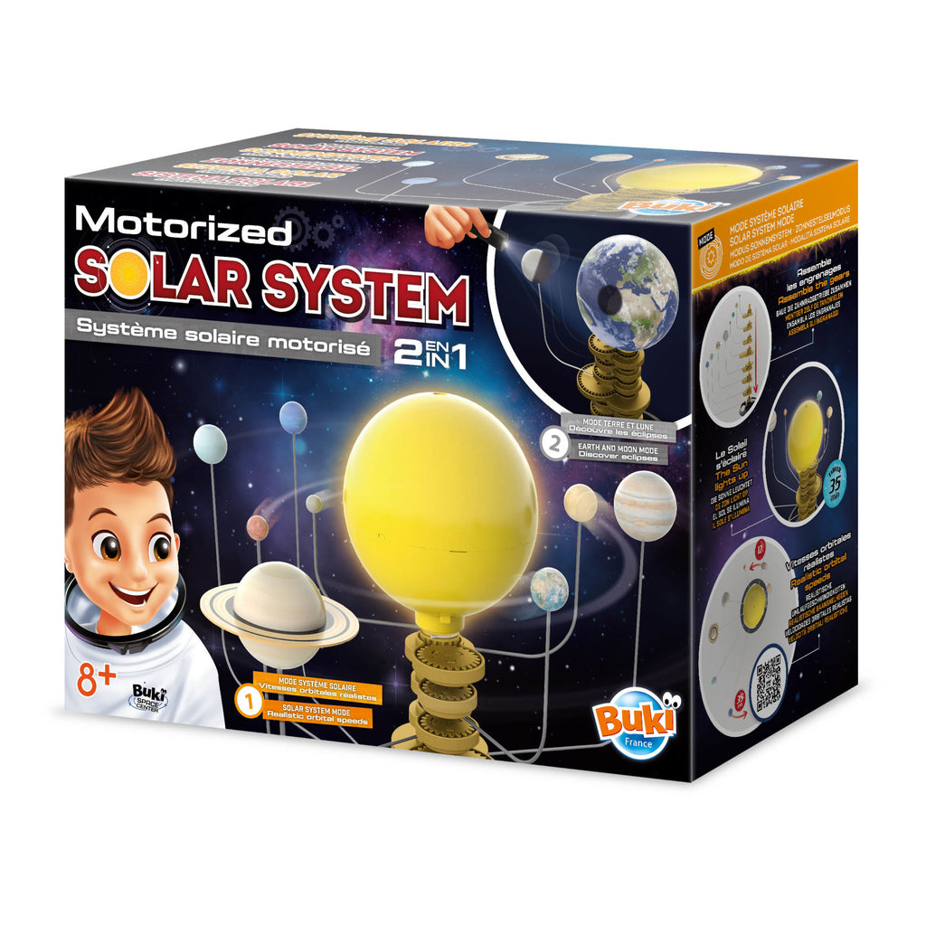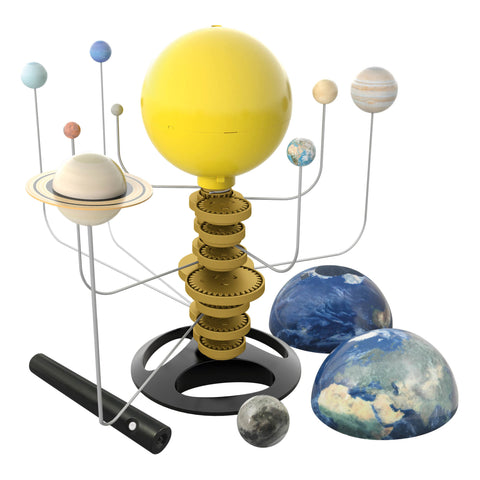 Inclus : 1 soleil, 2 dômes Terre, 1 base, 1 tige centrale, 15 engrenages, 8 tiges, 8 planètes, 1 lune, 1 lampe, 1 notice illustrée en couleurs.