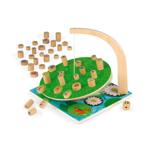 Chaque joueur doit choisir puis placer un animal/insecte sur le nénuphar sans le faire basculer ! Attention, la partie est perdue si les pions tombent ! Il faut être habile et tactique pour survivre dans la mare ! Ce jeu développe l’adresse et la concentration !