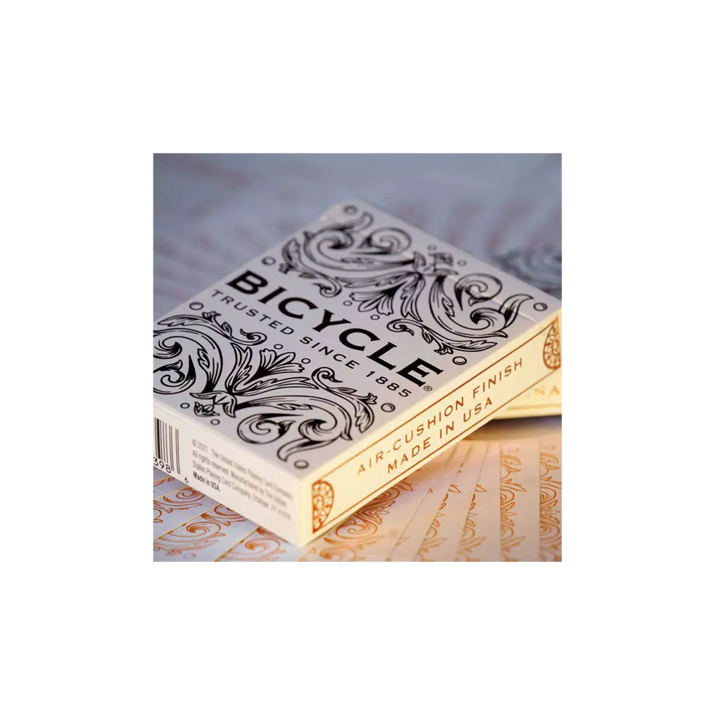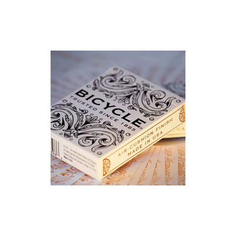 Jeu de 54 cartes imprimé sur du papier cartonné Bicycle® avec la célèbre finition Air-Cushion® pour des mélanges fluides et des performances optimales. Écologique jusqu'au bout des doigts avec son encre végétale non toxique et 100% recyclable. Fabriqué aux États-Unis, il se présente dans un élégant emballage rehaussé d'un film doré.