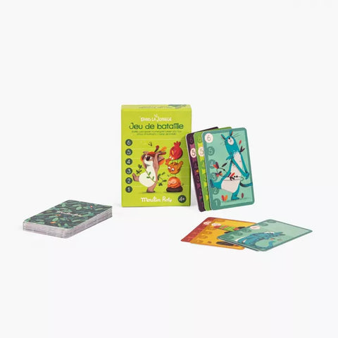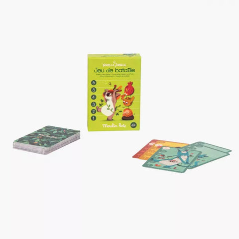 Le classique jeu de bataille revisité en 6 familles numérotées de 1 à 6, et illustrées des joyeux amis de la jungle. Les personnages sont de taille différente pour venir appuyer les chiffres et aider les joueurs à comprendre la valeur des cartes !