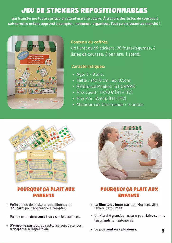 🎯 Zéro colle, zéro dégâts ! Ce jeu de stickers repositionnables transforme n'importe quelle surface en terrain de jeu sans laisser la moindre trace. 📚 Rangé dans un livret ultra-compact, il se glisse partout : restaurant, voiture, avion, voyage... l'ennui n'a aucune chance ! 🌱 Réutilisable et durable, c'est le choix responsable qui grandit avec votre enfant. 🧠 Pendant qu'il s'amuse, il développe son comptage et sa motricité fine. Un allié anti-ennui qui fait du bien à tous les niveaux ! ✨