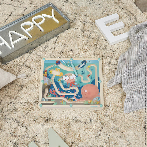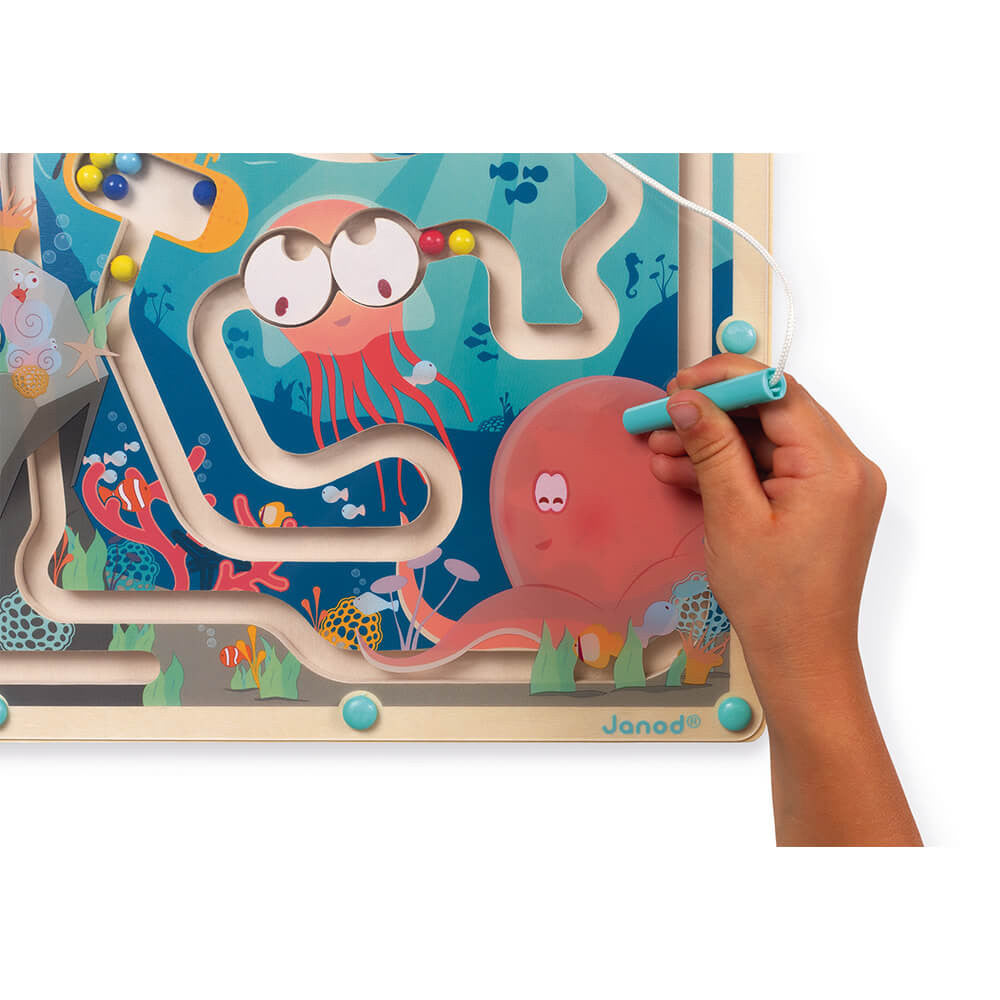 On exerce sa motricité fine grâce à ce joli jeu d'adresse pour les enfants à partir de 2 ans. Depuis la surface de l’océan, il faudra traverser le labyrinthe et apporter les 16 billes en direction du sous-marin à l’aide du stylet magnétique. Mais il faudra faire preuve de dextérité pour surmonter les embûches du parcours et gare aux yeux de la pieuvre qui n’en font qu’à leur tête au passage de la bille !